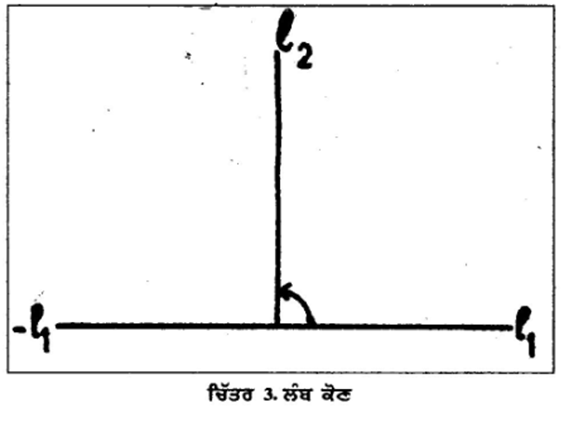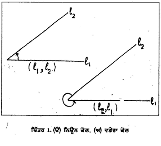 ਜੇਕਰ ਘੁੰਮਣ ਦੀ ਧਾਰਨਾ ਨੂੰ ਕੋਣ ਨਾਲੋਂ ਪੂਰਵਜ ਮੰਨਿਆ ਜਾਵੇ ਤਦ ਕੋਣ (11,12) ਨੂੰ (ਖੱਬੇ ਗੇੜ) ਘੁੰਮਣ ਨਾਲ ਜਾਂ ਸਿਖਰ ਦੁਆਲੇ ਘੁੰਮਾਉਣ ਦੀ ਉਸ ਮਿਕਦਾਰ ਨਾਲ, ਜਿਸ ਨਾਲ ਭੁਜਾ (11,12) ਨਾਲ ਸੰਪਾਤੀ ਹੋ ਜਾਵੇ, ਪ੍ਰਭਾਸ਼ਿਤ ਕੀਤਾ ਜਾ ਸਕਦਾ ਹੈ। ਇਕ ਸਿਖਰ ਵਾਲੇ ਦੋ ਕੋਣ (11,12) ਅਤੇ (m1 m2) ਬਰਾਬਰ ਹੁੰਦੇ ਹਨ। ਜੇਕਰ ਭੁਜਾ 11, ਨੂੰ 12 ਦੇ ਸੰਪਾਤੀ ਕਰਨ ਵਾਲਾ ਘੁੰਮਣ ਭੁਜਾ m1 ਨੂੰ m2 ਸੰਪਾਤੀ ਕਰਦਾ ਹੋਵੇ। (1, -1) ਸਿੱਧਾ ਕੋਣ ਹੁੰਦਾ ਹੈ ਜੋ ਸਿਖਰ ਵਿਚ ਦੀ ਲੰਘ ਰਹੀ ਕਿਸੇ ਰੇਖਾ ਦੀਆਂ ਦੋ ਅਰਧ ਰੇਖਾਵਾਂ ਦੁਆਰਾ ਬਣਦਾ ਹੈ। (ਵੇਖੋ ਚਿੱਤਰ 2)। (11,12) ਇਕ ਲੰਬ ਕੋਣ ਹੁੰਦਾ ਹੈ ਜੇਕਰ (11,12) = (12,-11)
