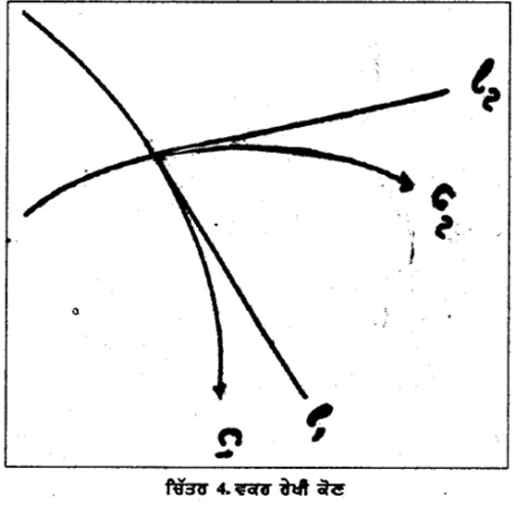 ਇਕ ਸਮਤਲ ਵਿਚ ਦੋ ਆਪਸੀ ਕੱਟਣ ਵਾਲੀਆਂ ਅਕੋਣੀ ਅਤੇ ਦਿਸ਼ਟ ਵਕਰਾਂ C1 ਅਤੇ C2 ਦੇ ਵਿਚਕਾਰ ਦਾ ਵਕਰ ਰੇਖੀ ਕੋਣ ਉਨ੍ਹਾਂ ਦੇ ਕਾਟ ਬਿੰਦੂ ਉੱਪਰ ਸਪੱਰਸ਼ੀ ਅਰਧ-ਰੇਖਾਵਾਂ 11 ਅਤੇ 12 ਦੇ ਇਕ ਜੋੜੇ ਦੇ ਵਿਚਕਾਰ ਦਾ ਕੋਣ ਹੁੰਦਾ ਹੈ। (ਵੇਖੋ ਚਿੱਤਰ 4)। ਜੇਕਰ ਇਹ ਵਕਰਾਂ ਇਕ ਸਤ੍ਹਾ ਉਪਰ ਹੋਣ ਤਾਂ ਇਨ੍ਹਾਂ ਦੇ ਵਿਚਕਾਰ ਦਾ ਕੋਣ ਹੁੰਦਾ ਹੈ। ਇਹ ਕੋਣ ਇਕ ਗੋਲਕਾਰ ਕੋਣ ਹੁੰਦਾ ਹੈ, ਜੇਕਰ ਇਹ ਦੋ ਵਕਰਾਂ ਇਕ ਗੋਲੇ ਦੇ ਵੱਡੇ ਦਾਇਰੇ ਹੋਣ। ਇਸ ਤੋਂ ਅੱਗੇ ਡਾਈਹੀਡਰਲ, ਟ੍ਰਾਈਹੀਡਰਲ ਅਤੇ ਪਾੱਲੀਹੀਡਰਲ ਕੋਣ ਵੀ ਹੁੰਦੇ ਹਨ।