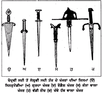 ਖੰਜਰ : ਇਹ ਛੋਟੇ ਫਲ ਵਾਲਾ ਅਤੇ ਹੱਥ ਨਾਲ ਵਰਤਿਆ ਜਾਣ ਵਾਲਾ ਇਕ ਹਥਿਆਰ ਹੈ। ਇਹ ਤਲਵਾਰ ਦਾ ਹੀ ਛੋਟਾ ਰੂਪ ਹੈ। ਪੁਰਾਤਨ ਸਮੇਂ ਦੇ ਖੰਜਰ ਅਤੇ ਤਲਵਾਰ ਵਿਚ ਫ਼ਰਕ ਲੱਭਣਾ ਕਾਫ਼ੀ ਮੁਸ਼ਕਿਲ ਹੈ। ਇਸ ਦੀ ਇਕ ਚੰਗੀ ਮਿਸਾਲ ਉੱਤਰੀ ਯੂਰਪ ਦੀ ਮਧ-ਕਾਲੀਨ ਸਕਰੈਮੈਸਕਸ ਹੈ, ਜਿਸ ਦਾ ਫਲ ਲਗਭਗ 10-15 ਸੈਂ. ਮੀ. ਲੰਬਾ ਹੈ। ਇਸ ਤੋਂ ਵੀ ਬਾਅਦ ਦੀ ਚੌੜੇ-ਫਲ ਵਾਲੀ ਕਿਸਮ ਸਿਨਕੁਏਡੀਆ ਹੈ ਜੋ 1475 ਤੋਂ 1550 ਤੱਕ ਪ੍ਰਚਲੱਤ ਸੀ। ਇਸ ਦੀ ਰੇਂਜ ਇੰਨੀ ਵੱਡੀ ਸੀ ਕਿ ਇਸ ਨੂੰ ਤਲਵਾਰਾਂ ਜਾਂ ਖੰਜਰ ਦੇ ਕਿਸੇ ਵੀ ਰੂਪ ਵਿਚ ਵਰਤਿਆ ਜਾ ਸਕਦਾ ਸੀ (ਚਿੱਤਰ ੳ)। ਫਿਰ ਵੀ ਤੇਰ੍ਹਵੀਂ ਸਦੀ ਤੱਕ ਖੰਜਰ ਨੂੰ ਆਮ ਤੌਰ ਤੇ ਇਕ ਵੱਖਰੇ ਹਥਿਆਰ ਵਜੋਂ ਮੰਨਿਆ ਜਾਂਦਾ ਰਿਹਾ ਹੈ।