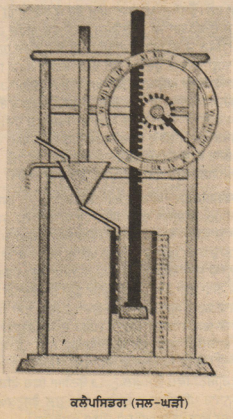 ੩ ਘੜੀ ਘੰਟਾ ਆਦਿਕ ਸਮਾਂ (ਵੇਲਾ) ਮਾਪਣ ਦਾ ਯੰਤ੍ਰ. ਭਾਰਤ ਵਿੱਚ ਸਭ ਤੋਂ ਪਹਿਲਾਂ ਧੁਪਘੜੀ (Sundial) ਅਤੇ ਜਲਘੜੀ (Clepsydra) ਪੁਰਾਣੇ ਵਿਦ੍ਵਾਨਾਂ ਨੇ ਬਣਾਈ, ਜਿਨ੍ਹਾਂ ਦਾ ਜਿਕਰ ‘ਗੋਲਾਧ੍ਯਾਯ’ ਆਦਿ ਜੋਤਿ ਦੇ ਪ੍ਰਾਚੀਨ ਸੰਸਕ੍ਰਿਤ ਗ੍ਰੰਥਾਂ ਵਿੱਚ ਪਾਇਆ ਜਾਂਦਾ ਹੈ.2 ਬਾਲੂਘੜੀ (Sandglass) ਅਤੇ ਪਿੱਤਲ ਲੋਹੇ ਆਦਿਕ ਧਾਤਾਂ ਦੇ ਚਕ੍ਰਾਂ ਤੇ ਕਮਾਣੀਆਂ ਵਾਲੀ ਕਲਦਾਰ ਘੜੀ (Clock, Timepiece, Pocket watch) ਵਿਦੇਸ਼ੀਆਂ ਦੀ ਕਾਢ ਹੈ.