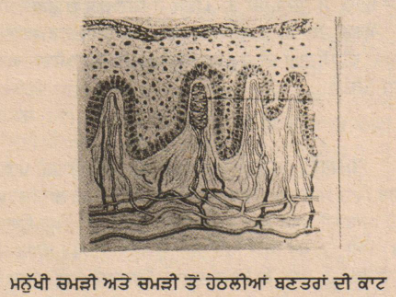 ਮਨੁੱਖੀ ਚਮੜੀ––ਮਨੁੱਖ ਵਿਚ ਚਮੜੀ ਦੀ ਮੋਟਾਈ ਸਰੀਰ ਦੇ ਵੱਖ ਵੱਖ ਹਿੱਸਿਆਂ ਤੇ ਵੱਖ ਵੱਖ ਹੁੰਦੀ ਹੈ। ਅੱਖ ਦੇ ਛੱਪਰਾਂ ਤੇ ਇਸ ਦੀ ਮੋਟਾਈ ਇਕ ਮਿ. ਮੀ. ਤੋਂ ਵੀ ਘੱਟ ਅਤੇ ਹੱਥਾਂ ਤੇ ਪੈਰਾਂ ਦੀਆਂ ਤਲੀਆਂ ਉਤੇ ਤਿੰਨ ਮਿ. ਮੀ. ਜਾਂ ਇਸ ਤੋਂ ਵੀ ਵੱਧ ਹੁੰਦੀ ਹੈ। ਇਹ ਲਚਕਦਾਰ, ਨਰਮ ਅਤੇ ਪੱਧਰੀ ਹੁੰਦੀ ਹੈ ਜਿਸ ਉਤੇ ਇਕ ਦੂਜੇ ਨੂੰ ਕਟਦੀਆਂ ਲਕੀਰਾਂ, ਵਲ, ਉਭਾਰ ਅਤੇ ਸੂਖ਼ਮ ਛੇਕ ਹੁੰਦੇ ਹਨ।
