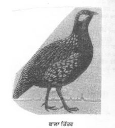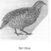 ਤਿੱਤਰ. ਸੰ. ਤਿੱਤਿਰ. ਫ਼ਾ ਦੁੱਰਾਜ. ਸੰਗ੍ਯਾ—ਇੱਕ ਜੰਗਲੀ ਪੰਛੀ ਜੋ ਭੂਰੇ ਅਤੇ ਕਾਲੇ ਰੰਗ ਦਾ ਭਿੰਨ ਭਿੰਨ ਹੁੰਦਾ ਹੈ. Partridge. ਕਾਲੇ ਤਿੱਤਰ (francolinus entellus) ਨੂੰ ‘ਸੁਬਹਾਨੀ’ ਆਖਦੇ ਹਨ, ਕਿਉਂਕਿ ਉਸ ਦੀ ਬੋਲੀ ਵਿੱਚ ‘ਸੁਬਹਾਨ ਤੇਰੀ ਕੁਦਰਤ ’ ਦਾ ਅਨੁਕਰਣ ਖਿਆਲ ਕੀਤਾ ਗਿਆ ਹੈ. ਸ਼ਿਕਾਰੀ ਲੋਕ ਦੋਵੇਂ ਜਾਤਿ ਦੇ ਤਿੱਤਰਾਂ ਨੂੰ ਪਾਲਕੇ ਬੁਲਾਰੇ ਦਾ ਕੰਮ ਲੈਂਦੇ ਹਨ. ਇਨ੍ਹਾਂ ਦੀ ਆਵਾਜ ਸੁਣਕੇ ਜੰਗਲੀ ਤਿੱਤਰ ਲੜਨ ਲਈ ਇਕੱਠੇ ਹੋ ਜਾਂਦੇ ਹਨ, ਜੋ ਧੰਦਾਲ (ਫੰਦੇ) ਵਿੱਚ ਫਸਦੇ, ਜਾਂ ਬੰਦੂਕ ਨਾਲ ਮਾਰੇ ਜਾਂਦੇ ਹਨ.