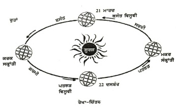 ਇਹਨਾਂ ਕਾਰਨਾਂ ਕਰਕੇ, ਧਰਤੀ ਦੇ ਵੱਖ-ਵੱਖ ਭਾਗ ਸਾਲ ਵਿੱਚ ਵੱਖ-ਵੱਖ ਸਮੇਂ ਉੱਤੇ ਵੱਖ-ਵੱਖ ਮਾਤਰਾ ਵਿੱਚ ਸੂਰਜੀ ਤਾਪ ਗ੍ਰਹਿਣ ਕਰਦੇ ਹਨ, ਜਿਸ ਤੋਂ ਰੁੱਤਾਂ ਬਣਦੀਆਂ ਹਨ ਅਤੇ ਉਹਨਾਂ ਵਿੱਚ ਤਬਦੀਲੀ ਹੁੰਦੀ ਹੈ। ਸੂਰਜ ਦੇ ਚੁਫੇਰੇ ਚੱਕਰ ਲਗਾਉਂਦੀ ਹੋਈ ਧਰਤੀ ਹੇਠ ਦਿੱਤੀਆਂ ਚਾਰ ਵਿਸ਼ੇਸ਼ ਹਾਲਤਾਂ ਵਿੱਚੋਂ ਗੁਜ਼ਰਦੀ ਹੈ, ਜਿਸ ਤੋਂ ਰੁੱਤਾਂ ਹੋਂਦ ਵਿੱਚ ਆਉਂਦੀਆਂ ਹਨ (ਦੇਖੋ ਰੇਖਾ-ਚਿੱਤਰ) :