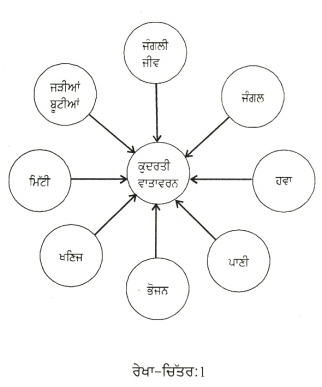 1. ਕੁਦਰਤੀ ਵਾਤਾਵਰਨ (Natural Environment) : ਕੁਦਰਤੀ ਵਾਤਾਵਰਨ ਮਨੁੱਖ ਦੀਆਂ ਸਭ ਤਰ੍ਹਾਂ ਦੀਆਂ ਲੋੜਾਂ ਪੂਰੀਆਂ ਕਰਦਾ ਹੈ। ਉਦਾਹਰਨ ਦੇ ਤੌਰ ਤੇ, ਮਨੁੱਖ ਨੂੰ ਕੁਦਰਤੀ ਵਾਤਾਵਰਨ ਤੋਂ ਹਵਾ, ਪਾਣੀ, ਮਿੱਟੀ, ਭੋਜਨ, ਖਣਿਜ ਪਦਾਰਥ, ਊਰਜਾ, ਲੱਕੜੀ, ਜੰਗਲੀ ਜੀਵ, ਜੜੀਆਂ-ਬੂਟੀਆਂ, ਆਦਿ ਪ੍ਰਾਪਤ ਹੁੰਦੇ ਹਨ (ਰੇਖਾ-ਚਿੱਤਰ:1)। ਇਹ ਸਾਰੇ ਤੱਤ ਇੱਕ ਦੂਜੇ ਨੂੰ ਪ੍ਰਭਾਵਿਤ ਕਰਦੇ ਹਨ ਅਤੇ ਇਹਨਾਂ ਦੀ ਆਪਸੀ ਕਿਰਿਆ (interaction) ਤੋਂ ਹੀ ਕੁਦਰਤੀ ਵਾਤਾਵਰਨ ਬਣਦਾ ਹੈ।