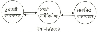 ਕੁਦਰਤੀ ਵਾਤਾਵਰਨ, ਮਨੁੱਖੀ ਗਤੀਵਿਧੀਆਂ ਅਤੇ ਸਮਾਜਿਕ ਵਾਤਾਵਰਨ ਦਾ ਆਪਸੀ ਰਿਸ਼ਤਾ ਪਰਿਆਵਰਨ ਵਿਗਿਆਨ ਦੇ ਸਿਧਾਂਤ ਉੱਤੇ ਨਿਰਭਰ ਕਰਦਾ ਹੈ। ਕੁਦਰਤੀ ਵਾਤਾਵਰਨ, ਮਨੁੱਖੀ ਗਤੀਵਿਧੀਆਂ ਅਤੇ ਸਮਾਜਿਕ ਵਾਤਾਵਰਨ ਇੱਕ ਦੂਜੇ ਨਾਲ ਡੂੰਘੇ ਤੌਰ ਤੇ ਜੁੜੇ ਹੋਏ ਹਨ (ਰੇਖਾ-ਚਿੱਤਰ-3)। ਜੇਕਰ ਇਹਨਾਂ ਵਿੱਚੋਂ ਇੱਕ ਵੀ ਸਹਿਯੋਗ ਨਹੀਂ ਦਿੰਦਾ ਤਾਂ ਪੂਰਾ ਪਰਿਆਵਰਨਿਕ ਸੰਤੁਲਨ ਵਿਗੜ ਜਾਂਦਾ ਹੈ। ਅਸਲ ਵਿੱਚ, ਕੁਦਰਤੀ ਵਾਤਾਵਰਨ, ਮਨੁੱਖੀ ਗਤੀਵਿਧੀਆਂ ਅਤੇ ਸਮਾਜਿਕ ਵਾਤਾਵਰਨ ਇੱਕ ਦੂਜੇ ਨੂੰ ਪ੍ਰਭਾਵਿਤ ਕਰਦੇ ਹਨ ਅਤੇ ਇੱਕ ਦੂਜੇ ਤੋਂ ਪ੍ਰਭਾਵਿਤ ਹੁੰਦੇ ਹਨ। ਇੱਕ ਵਿੱਚ ਆਈ ਤਬਦੀਲੀ ਦੂਜੇ ਵਿੱਚ ਤਬਦੀਲੀ ਲਿਆਉਂਦੀ ਹੈ।