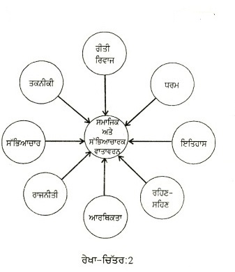 2. ਸਮਾਜਿਕ ਸੱਭਿਆਚਾਰਕ ਵਾਤਾਵਰਨ (Social and Cultural Environment) : ਕੁਦਰਤੀ ਵਾਤਾਵਰਨ ਨੂੰ ਮਨੁੱਖ ਨੇ ਆਪਣੀਆਂ ਲੋੜਾਂ ਅਤੇ ਖਾਹਸ਼ਾਂ ਦੀ ਪੂਰਤੀ ਲਈ ਬਹੁਤ ਜ਼ਿਆਦਾ ਬਦਲ ਦਿੱਤਾ ਹੈ। ਇਸ ਬਦਲੇ ਹੋਏ ਵਾਤਾਵਰਨ ਨੂੰ ਸਮਾਜਿਕ ਅਤੇ ਸੱਭਿਆਚਾਰਕ ਵਾਤਾਵਰਨ ਕਿਹਾ ਜਾਂਦਾ ਹੈ। ਸਮਾਜਿਕ ਵਾਤਾਵਰਨ ਇਤਿਹਾਸਿਕ, ਧਾਰਮਿਕ, ਸਮਾਜਿਕ, ਤਕਨੀਕੀ, ਰਾਜਨੀਤਿਕ, ਆਰਥਿਕ ਆਦਿ ਤੱਤਾਂ ਦੀ ਆਪਸੀ ਕਿਰਿਆ (interaction) ਅਤੇ ਪ੍ਰਭਾਵਾਂ ਤੋਂ ਬਣਦਾ ਹੈ (ਰੇਖਾ-ਚਿੱਤਰ:2)।