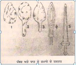 ਤਾਂ ਉਨ੍ਹਾਂ ਜੀਵ-ਜੰਤੂਆਂ ਜਿੰਨਾਂ ਬਲ ਸੀ, ਨਾ ਉਨ੍ਹਾਂ ਜਿਹੀ ਸਖ਼ਤ ਤੇ ਮੋਟੀ ਚਮੜੀ ਸੀ ਅਤੇ ਨਾ ਹੀ ਉਸ ਕੋਲ ਉਨ੍ਹਾਂ ਵਰਗੇ ਤਿੱਖੇ ਤੇ ਮਾਰੂ ਦੰਦ ਤੇ ਨਹੁੰ ਸਨ। ਆਪਣੀ ਬੁੱਧੀ ਤੇ ਤਜਰਬੇ ਨਾਲ ਮਨੁੱਖ ਨੇ ਮੁੱਢਲੇ ਸ਼ਸਤਰਾਂ ਦੀ ਕਾਢ ਕੱਢੀ ਹੋਵੇਗੀ। ਡੰਡੇ ਜਾਂ ਸੋਟੀ ਦਾ ਵਿਕਾਸ ਬਰਛੇ, ਗੁਰਜ, ਤਲਵਾਰ, ਬੱਲਮ ਅਤੇ ਆਧੁਨਿਕ ਸੰਗੀਨ ਦੇ ਰੂਪ ਵਿਚ ਹੋਇਆ। ਇਸੇ ਤਰ੍ਹਾਂ ਦੂਰੋਂ ਮਾਰਨ ਵਾਲਾ ਭਾਲਾ, ਤੀਰ ਕਮਾਨ, ਗੁਲੇਲ, ਗੋਲੀ ਤੇ ਹੱਥ-ਗੋਲਾ ਅਤੇ ਆਧੁਨਿਕ ਐਟਮ ਬਣ ਗਿਆ।