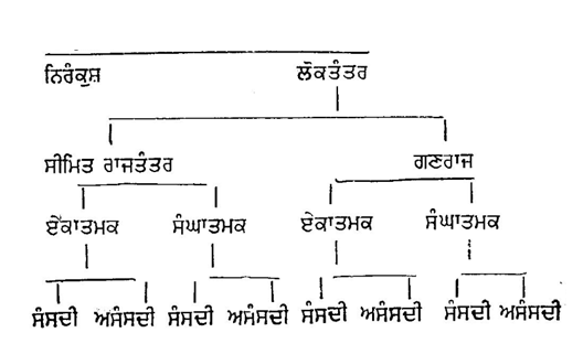 ਸਰਕਾਰਾਂ ਦੇ ਕਈ ਰੂਪ ਹੋ ਸਕਦੇ ਹਨ ਜਿਵੇਂ ਕਿ ਸੰਸਦੀ ਤੇ ਪ੍ਰਧਾਨਗੀ, ਇਕਾਤਮਿਕ ਤੇ ਸੰਘਾਤਮਿਕ ਆਦਿ। ਜੇਕਰ ਕਾਰਜਪਾਲਿਕਾ ਵਿਧਾਨਪਾਲਿਕਾ ਪ੍ਰਤਿ ਉੱਤਰਦਾਈ ਹੈ ਅਤੇ ਦੋਹਾਂ ਵਿਚਕਾਰ ਬਹੁਤ ਨੇੜੇ ਦਾ ਸੰਬੰਧ ਹੈ ਤਾਂ ਉਸ ਨੂੰ ਸੰਸਦੀ ਸਰਕਾਰ ਕਿਹਾ ਜਾਂਦਾ ਹੈ ਜਿਵੇਂ ਇੰਗਲੈਂਡ ਅਤੇ ਭਾਰਤ ਵਿੱਚ ਸੰਸਦੀ ਸਰਕਾਰ ਹੈ। ਜੇਕਰ ਕਾਰਜਪਾਲਿਕਾ, ਵਿਧਾਨਪਾਲਿਕਾ ਦੇ ਪ੍ਰਤਿ ਉੱਤਰਦਾਈ ਨਹੀਂ ਹੈ ਅਤੇ ਦੋਨੋਂ ਇੱਕ ਦੂਜੇ ਤੋਂ ਬਿਲਕੁਲ ਵੱਖਰੇ ਹਨ ਉਸ ਨੂੰ ਪ੍ਰਧਾਨਾਤਮਿਕ ਸਰਕਾਰ ਕਿਹਾ ਜਾਂਦਾ ਹੈ ਜਿਵੇਂ ਅਮਰੀਕਾ ਦੀ ਸਰਕਾਰ। ਇਸੇ ਤਰ੍ਹਾਂ ਜੇਕਰ ਪ੍ਰਾਂਤਕ ਸਰਕਾਰਾਂ ਨੂੰ ਆਪਣੀ ਇੱਛਾ ਅਨੁਸਾਰ ਆਪਣਾ ਸ਼ਾਸਨ ਚਲਾਉਣ ਦੀ ਸੁਤੰਤਰਤਾ ਹੋਵੇ ਅਤੇ ਕੇਂਦਰ ਸਰਕਾਰ ਉਹਨਾਂ ਦੀ ਸੁਤੰਤਰਤਾ ਨੂੰ ਖੋਹ ਨਾ ਸਕਦੀ ਹੋਵੇ, ਤਾਂ ਸਰਕਾਰ ਦਾ ਰੂਪ ਸੰਘਾਤਮਿਕ ਹੁੰਦਾ ਹੈ ਜਿਵੇਂ ਭਾਰਤ ਅਤੇ ਅਮਰੀਕਾ। ਇਸ ਦੇ ਵਿਪਰੀਤ ਜੇਕਰ ਪ੍ਰਾਂਤਕ ਸਰਕਾਰਾਂ ਕੇਂਦਰੀ ਸਰਕਾਰ ਦੇ ਪੂਰੇ ਨਿਯੰਤਰਨ ਅਧੀਨ ਹੋਣ ਅਤੇ ਕੇਂਦਰ ਸਰਕਾਰ ਦੇ ਆਦੇਸ਼ ਅਨੁਸਾਰ ਕੰਮ ਕਰਦੀਆਂ ਹੋਣ ਤਾਂ ਸਰਕਾਰ ਦਾ ਰੂਪ ਇਕਾਤਮਿਕ ਹੁੰਦਾ ਹੈ ਜਿਵੇਂ ਇੰਗਲੈਂਡ।